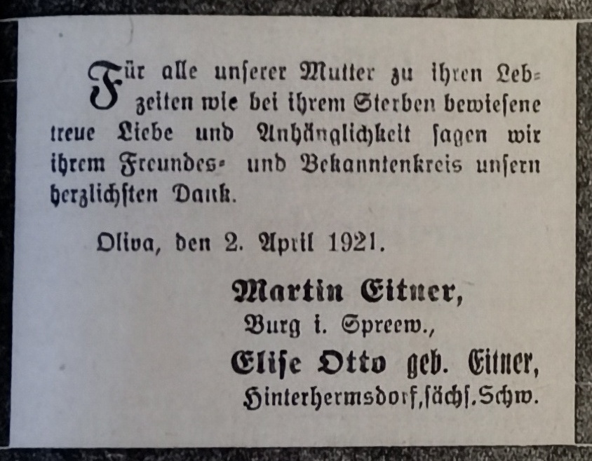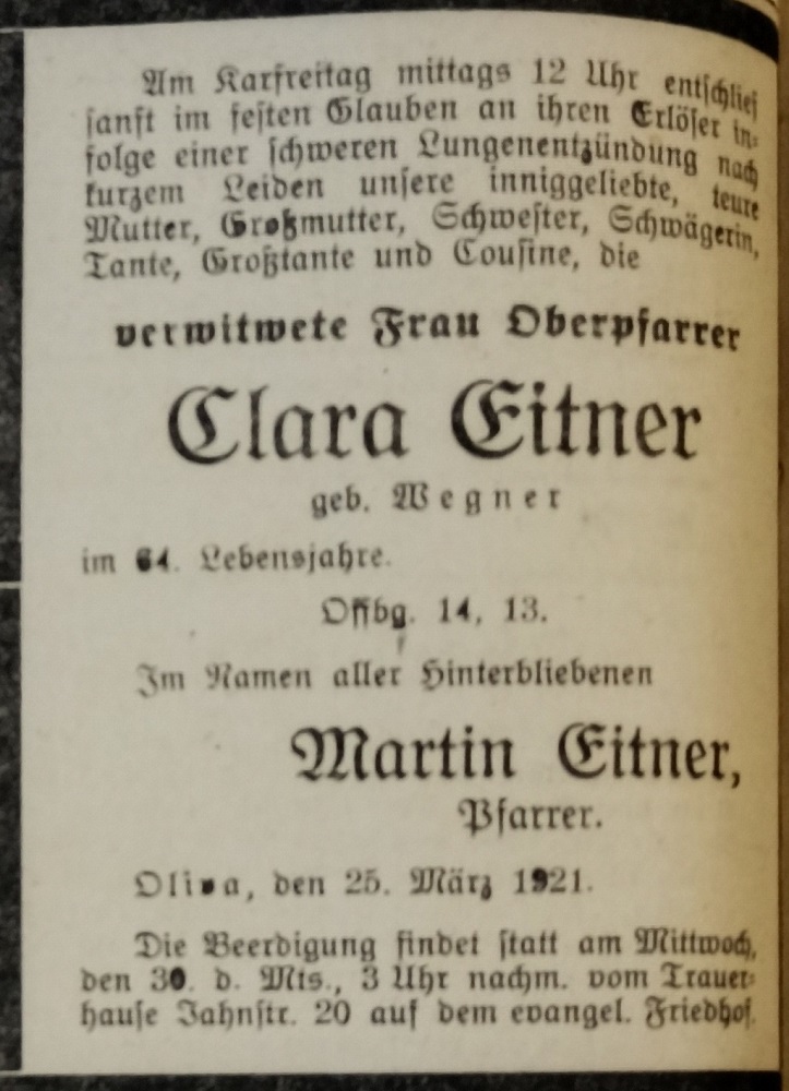 Clara Eitner zd. Wegner. Martin Eitner. Danziger Kreis-Zeitung 1921. Przekazała Grażyna Niemyjska.