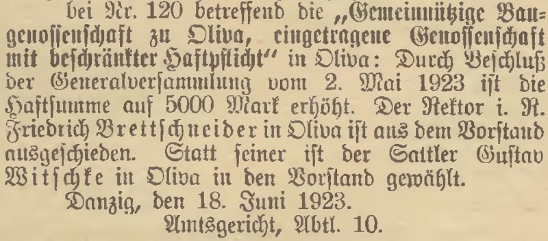 Pod nr 120 w sprawie „niedochodowej spółdzielni budowlanej w Oliwie, zarejestrowanej spółdzielni z ograniczoną odpowiedzialnością” w Oliwie: Uchwałą Walnego Zgromadzenia z dnia 2 maja 1923 r. kwota zobowiązania została podwyższona do 5000 marek. Emerytowany rektor Friedrich Brettschneider w Oliwie złożył rezygnację z członkostwa w zarządzie. Na jego miejsce do zarządu w Oliwie został wybrany rymarz Gustav Witschke. Gdańsk, 18 czerwca 1923 r. Sąd Rejonowy, Wydz. 10. Źródło nieznane.