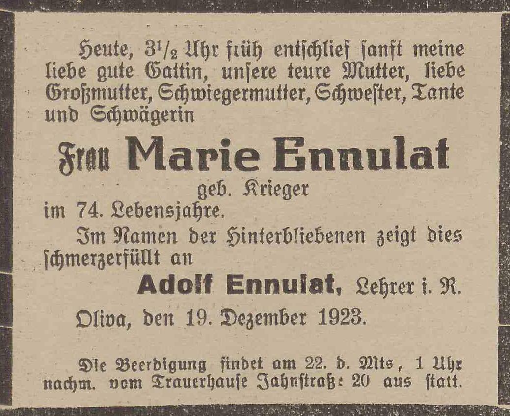 Marie Ennulat zd. Kriger. Adolf Ennulat, Lehrer i. R. Olivaer Zeintung nr 296 z 20. 12. 1923 r.