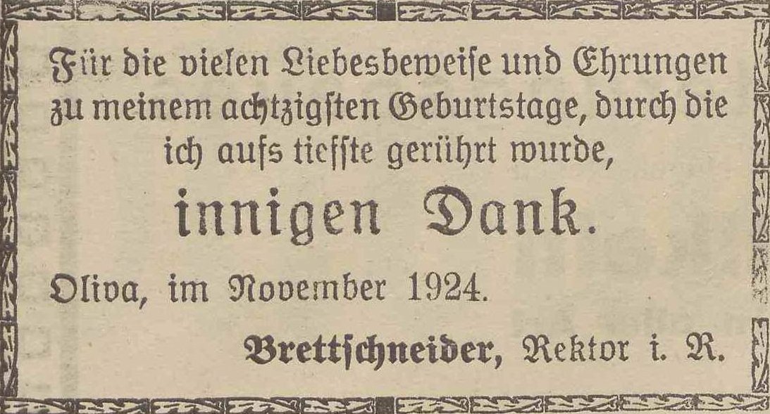 Friedrich Brettschneider. Osiemdziesiąte urodziny. Olivaer Zeintung nr 271 z 18. 11. 1924 r.