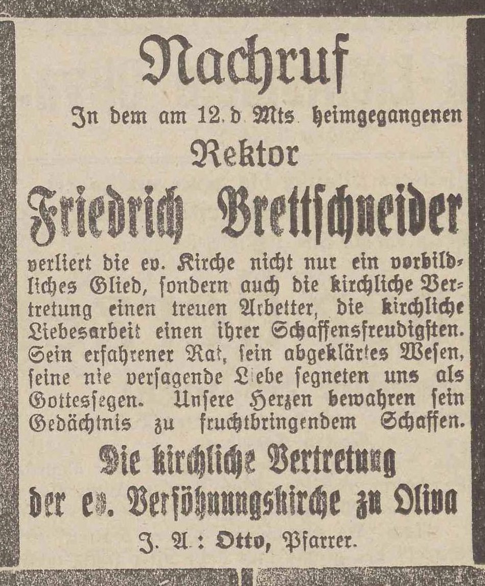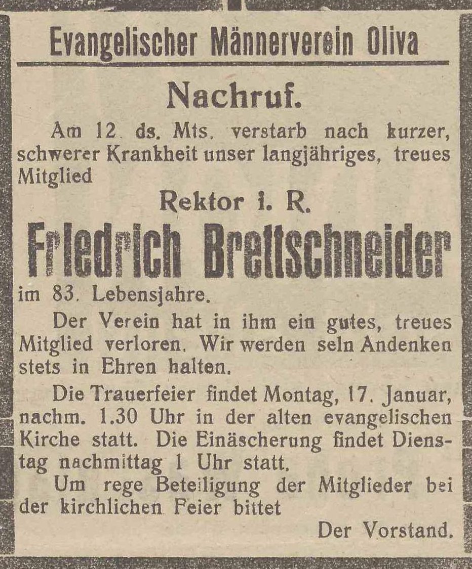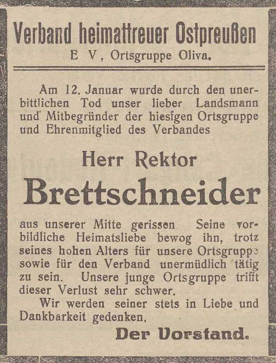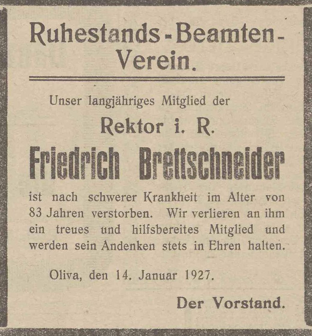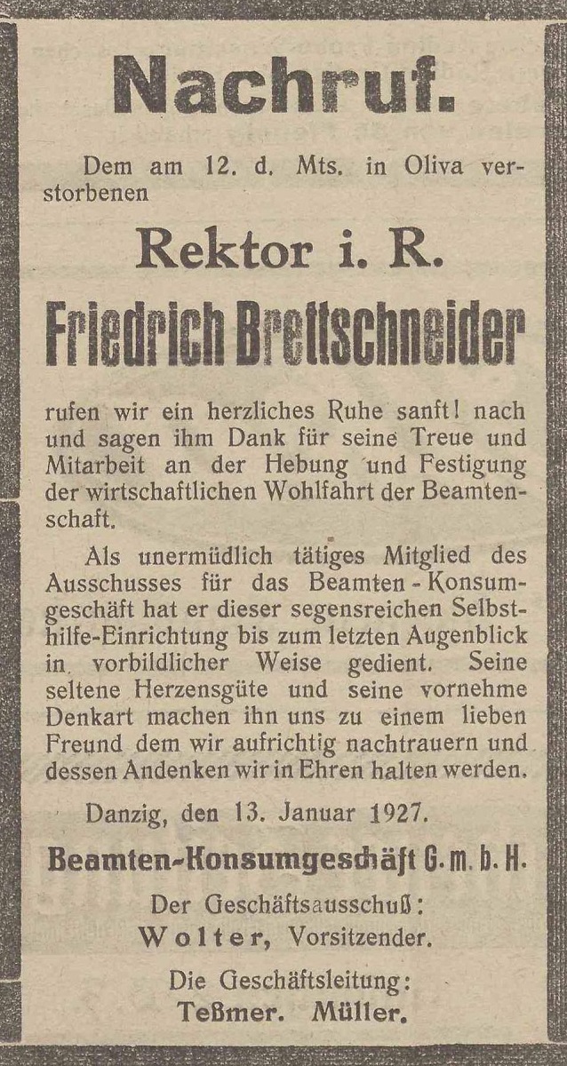 Friedrich Brettschneider. Olivaer Zeintung nr 11 z 14. 01. 1927 r.