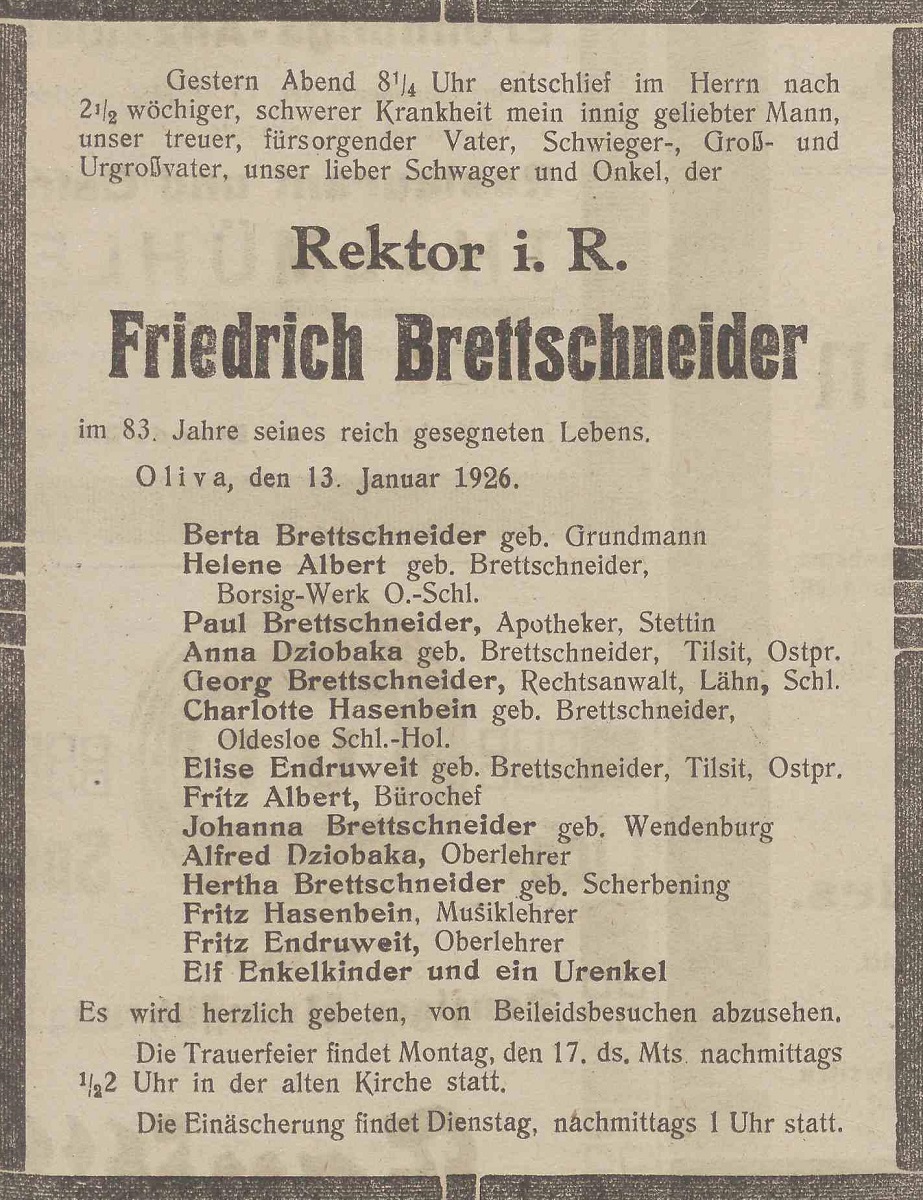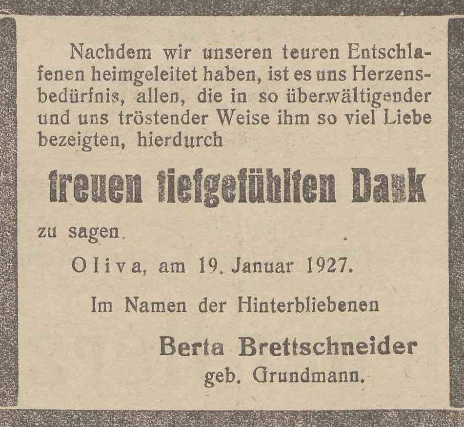 Friedrich Brettschneider. Berta Brettschneider zd. Grundmann. Fritz Albert, Helene Albert zd. Brettschneider. Alfred Dziobaka, Anna Dziobaka zd. Bauunternehmer. Fritz Hasenbein, Charlotte Hansenbein zd. Brettschneider. Fritz Endruweit, Elise Endruweit zd. Brettschneider. Paul Bankbeamter. Georg Brettschneider. Johanna Brettschneider zd. Wendenburg. Herta Brettschneider zd. Scherbening. Olivaer Zeintung nr 11 z 14. 01. 1927 r.