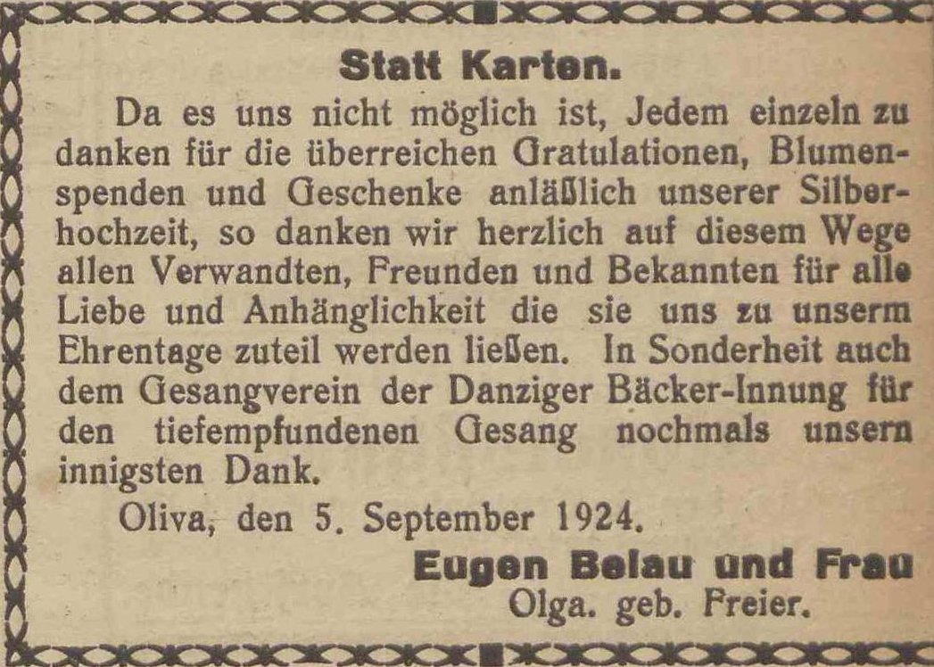 Eugen Belau. Olga Belau zd. Freier. 25 rocznica ślubu. Olivaer Zeintung nr 210 z 08. 09. 1924 r.