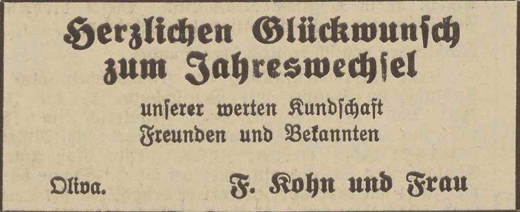 F. Kohn. Podziękowania noworoczne, Olivaer Zeitung nr 305 z 31. 12. 1924.