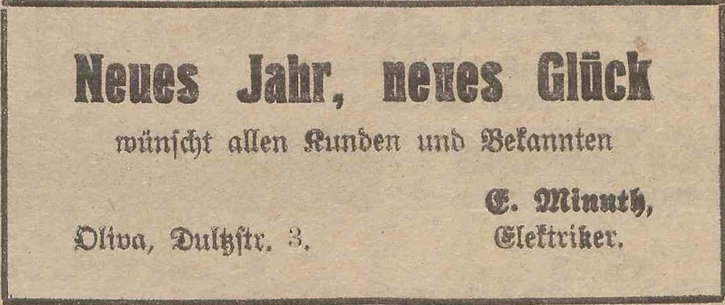 Emil Minuth, Elektriker. Podziękowania noworoczne, Olivaer Zeitung nr 306 z 31. 12. 1928.