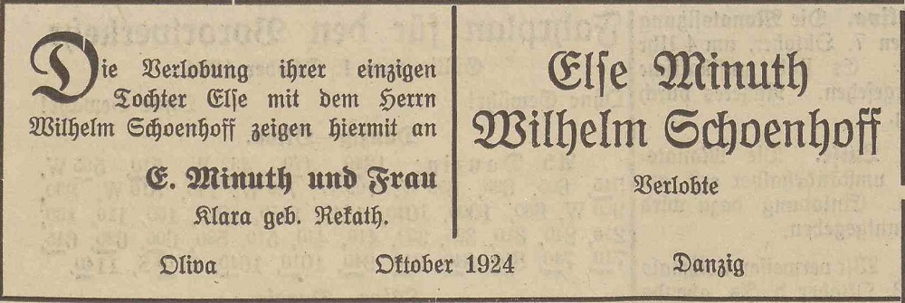 Emil Minuth. Klara Minuth zd. Rekath. Olivaer Zeintung nr 230 z 01. 10. 1924 r.