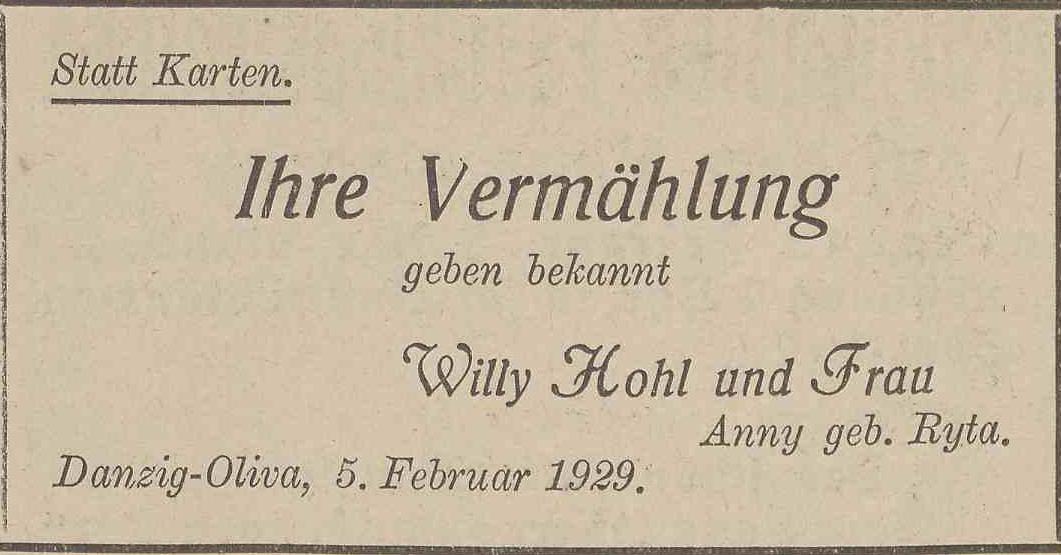 Willy Kohl. Anny Kohl zd. Ryta. Olivaer Zeintung nr 34 z 09. 02. 1929 r.