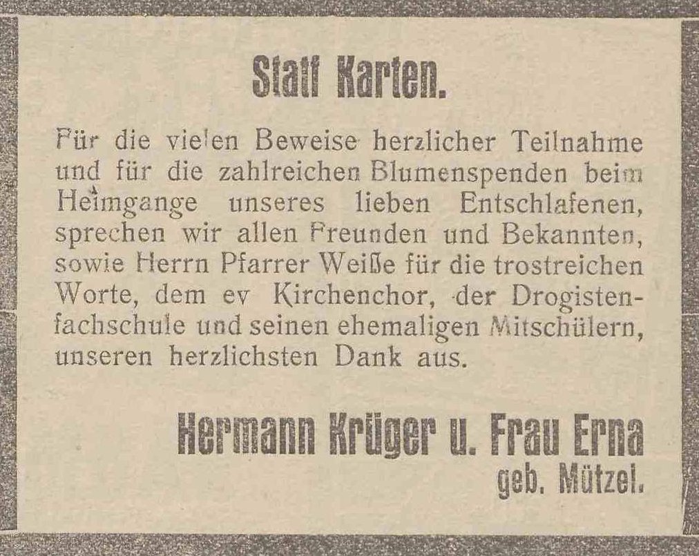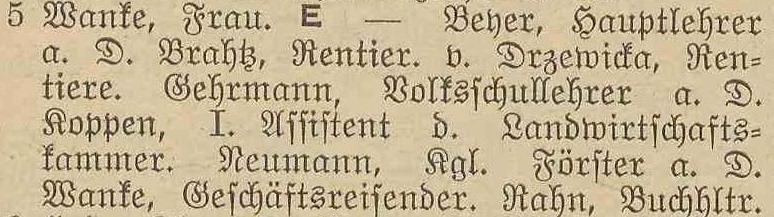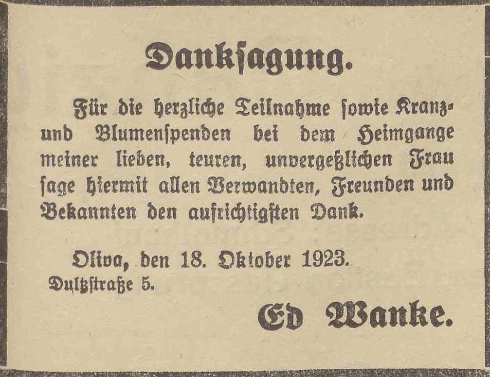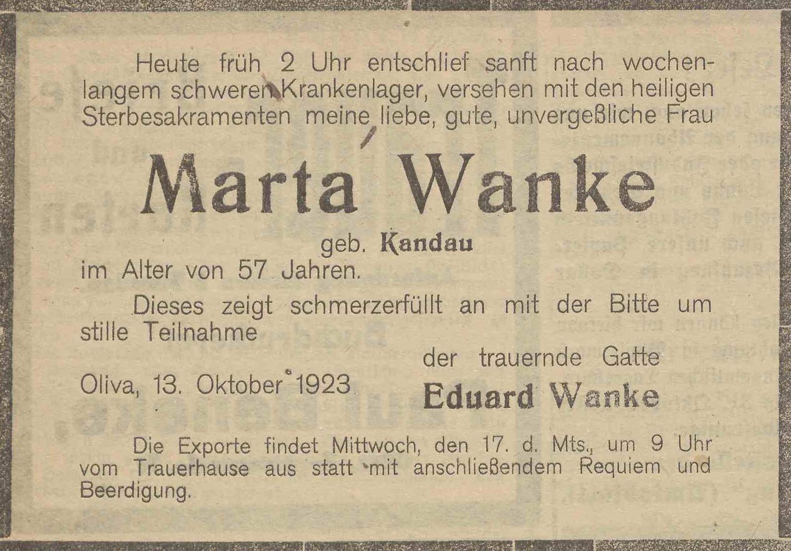 Marta Wanke zd. Kandau. Eduard Wanke. Olivaer Zeintung nr 240 z 15. 10. 1923 r.