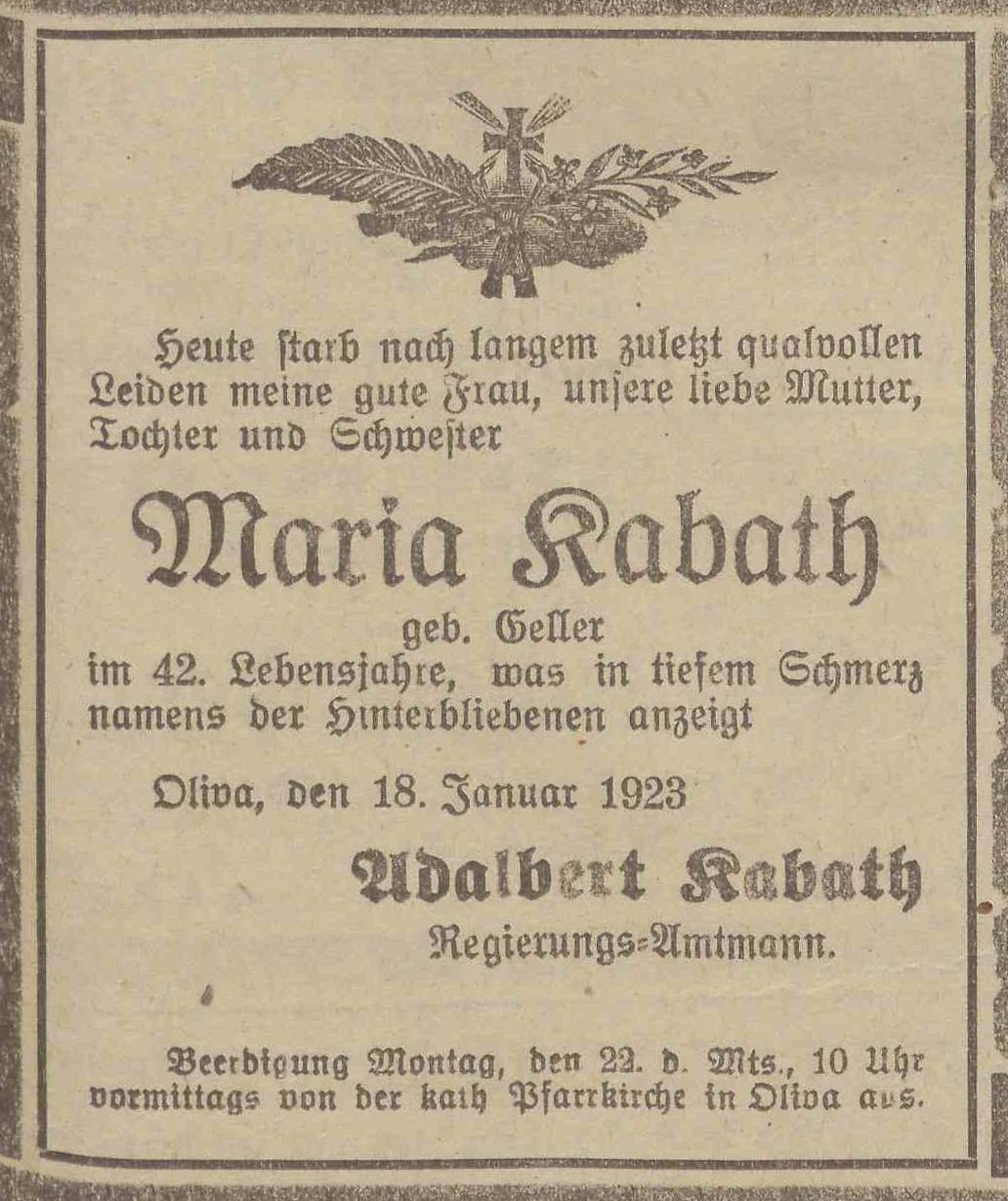 Maria Kabath z.d. Geller. Adalbert Kabath. Olivaer Zeintung nr 17 z 20. 01. 1923 r.