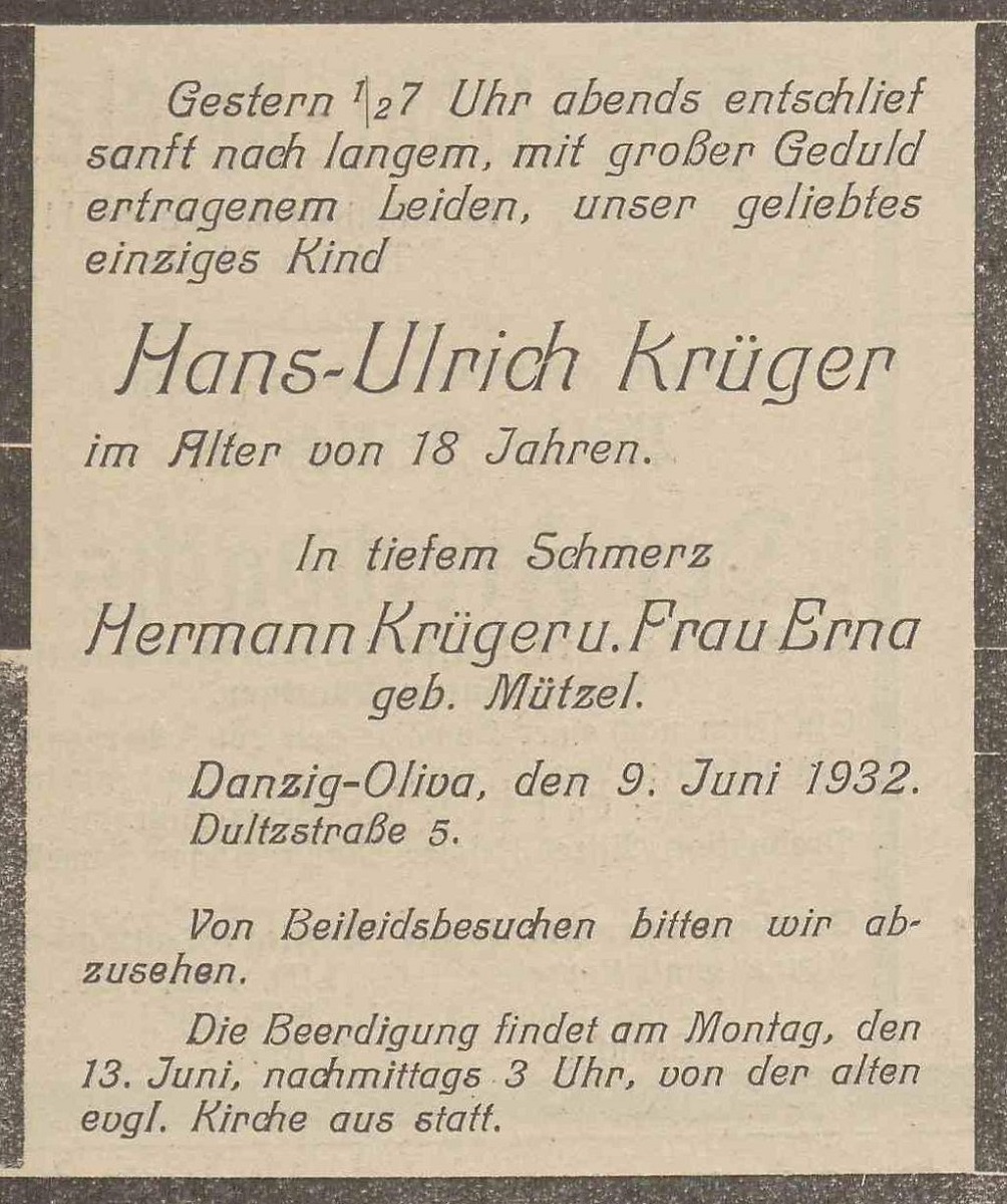 Hans-Urlich Krüger. Hermann Krüger. Erna Krüger zd. Mützel. Danzig-Olivaer Zeintung nr 134 z 10. 06. 1932 r.
