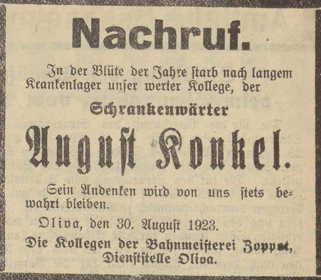 August Konkel. Olivaer Zeintung nr 202 z 31. 08. 1923 r.