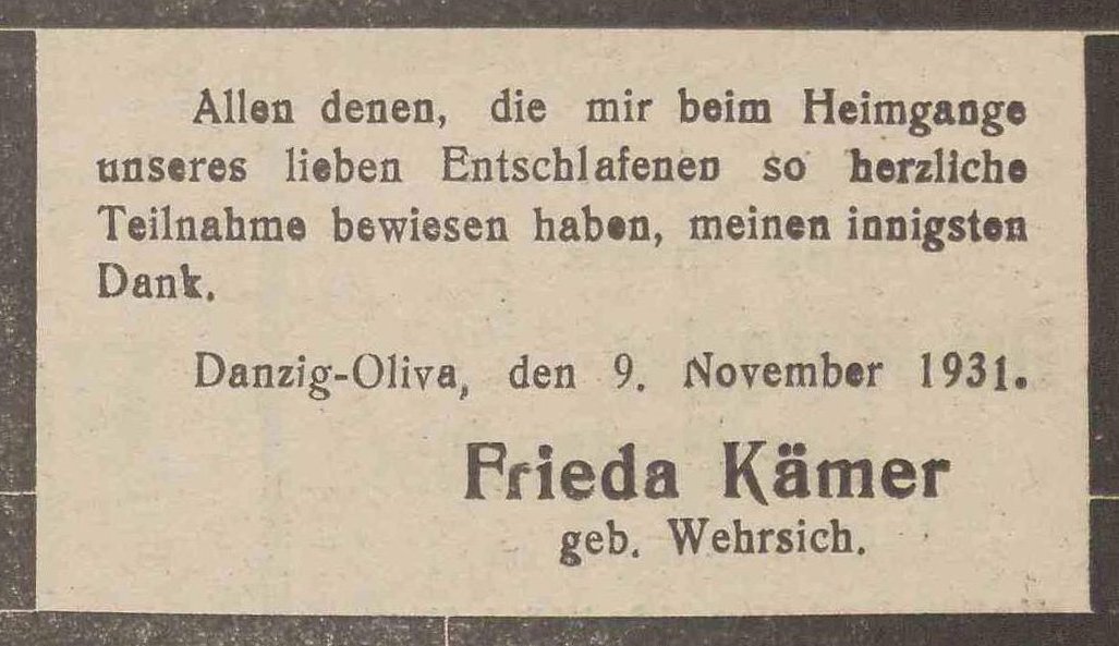 Frieda Kämer. Danzig-Olivaer Zeintung nr 263 z 09. 11. 1931 r.