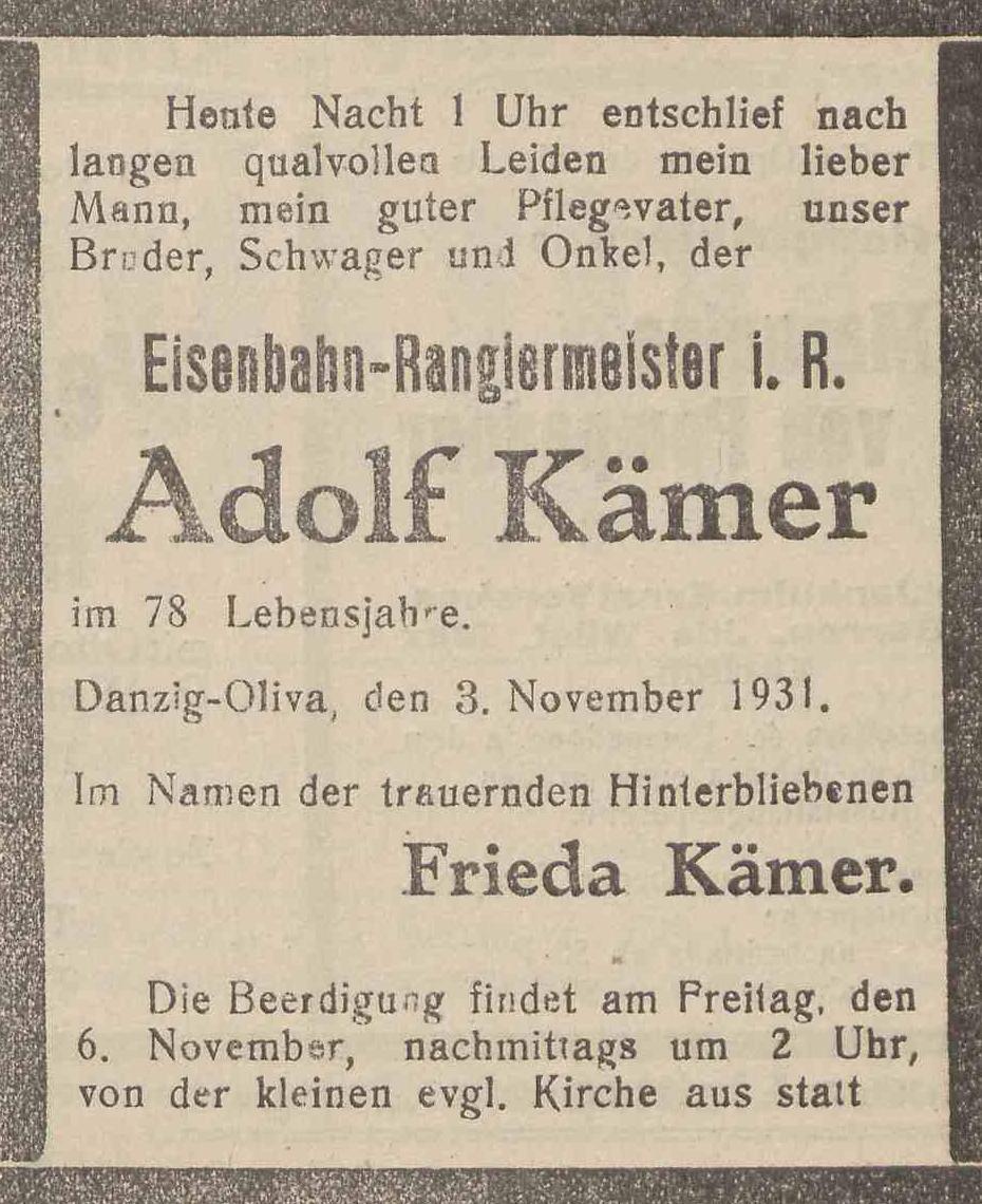 Adolf Kämer. Frieda Kämer. Danzig-Olivaer Zeintung nr 259 z 04. 11. 1931 r.