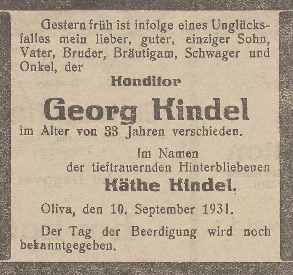 Georg Kindel. Käthe Kindel. Danzig-Olivaer Zeintung nr 212 z 10. 09. 1931 r.