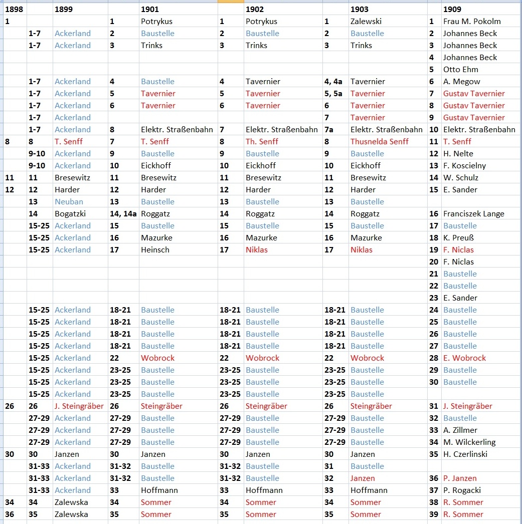 Poniższe zestawienie przedstawia przypuszczalną zmianę numeracji uliy, która następowała pomiędzy 1897 a 1909 rokiem.
