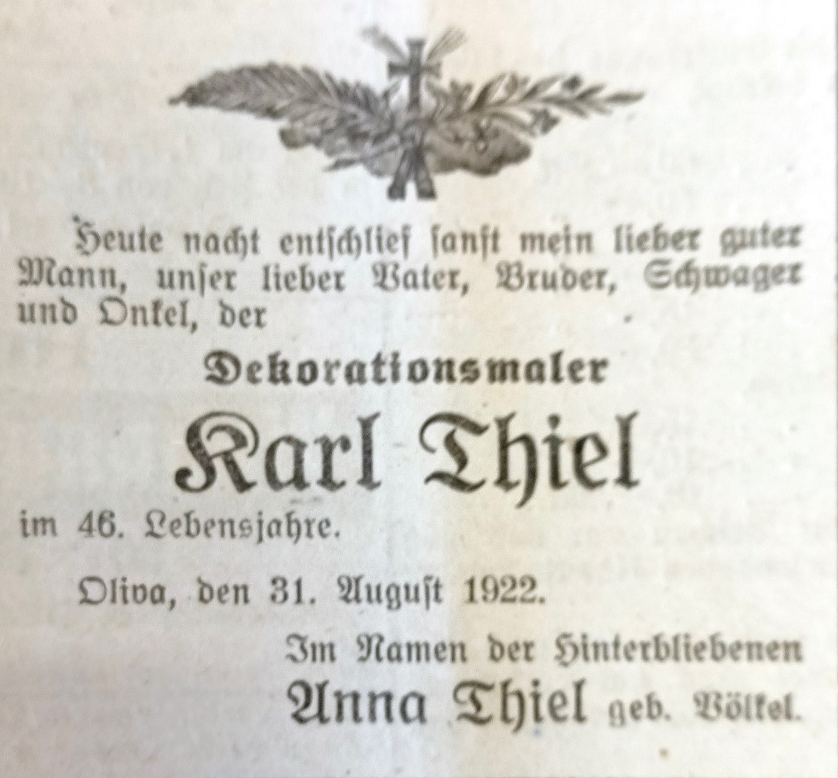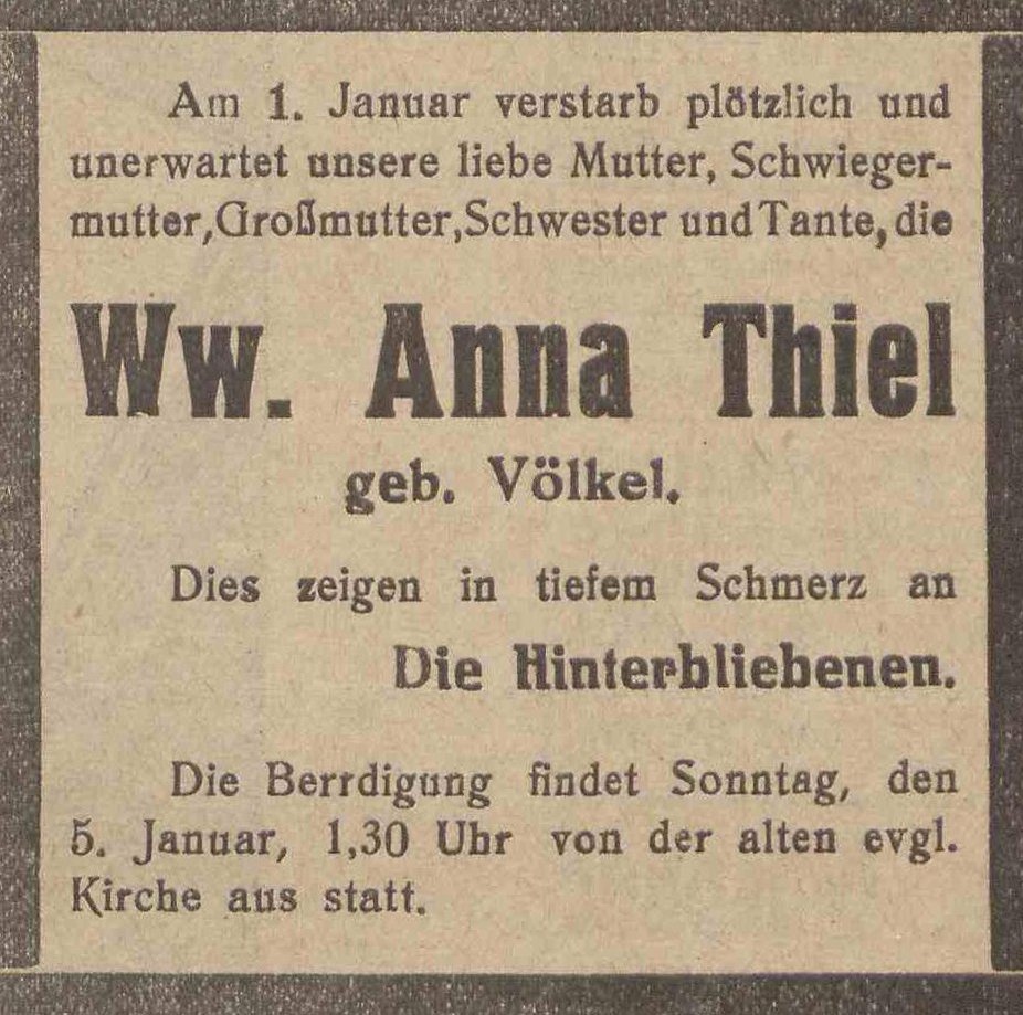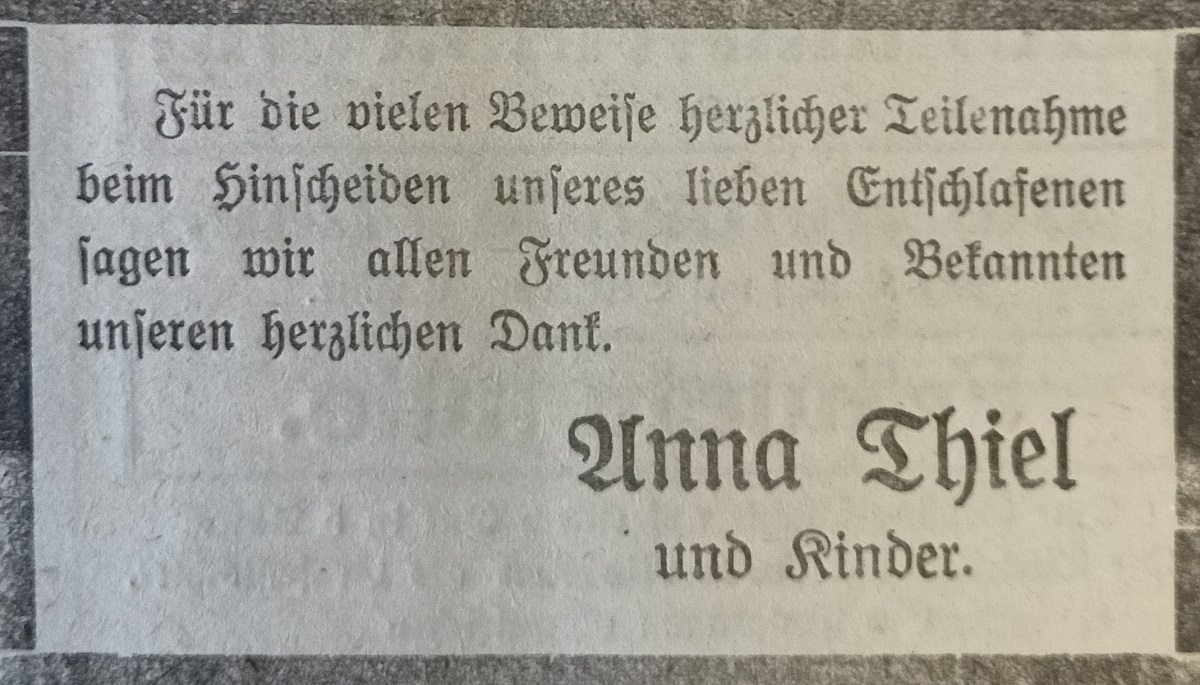 Karl Thiel. Anna Thiel zd. Völkerl. Danziger Kreis-Zeitung 1922. Przekazała Grażyna Niemyjska.