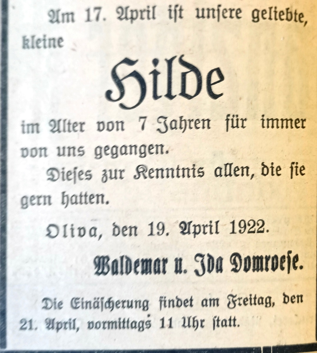 Hilde Domroese. Walemar Domroese. Ida Domroese. 17. 04. 1922. Danziger Kreis-Zeitung 1922. Przekazała Grażyna Niemyjska.