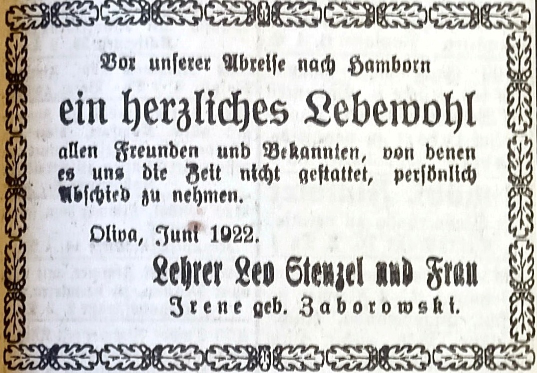 Leo Stenzel. Irene Stenzel zd. Zaborowski. Danziger Kreis-Zeitung 1922. Przekazała Grażyna Niemyjska.