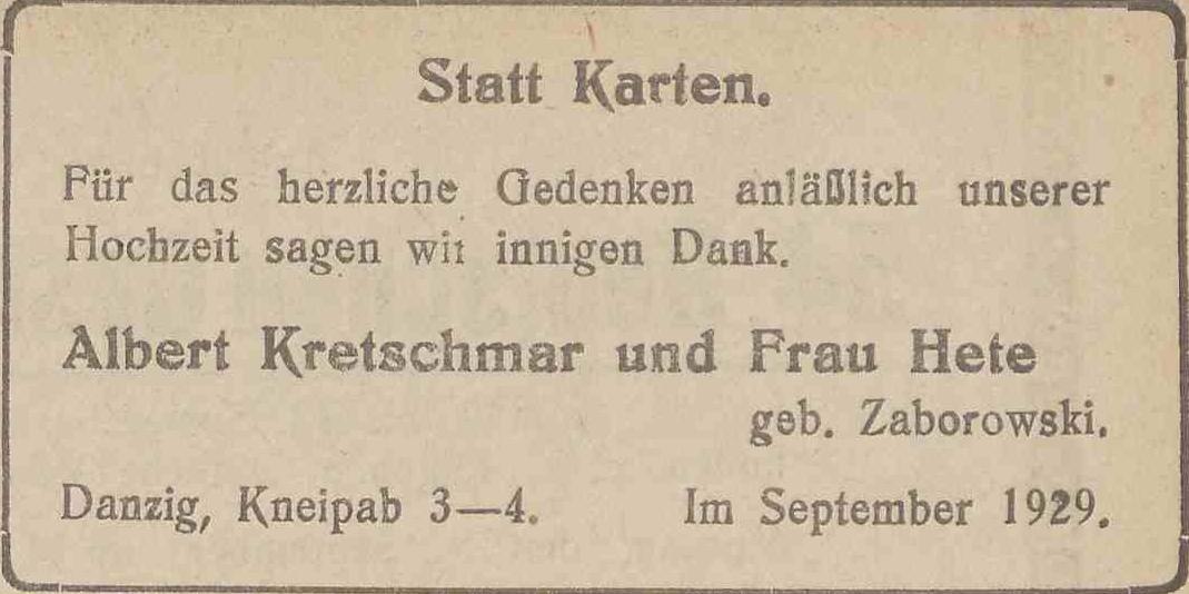 Hete Kretschamer zd. Zaborowski. Albert Kretschamer. Olivaer Zeintung nr 211 z 09. 09. 1929 r.