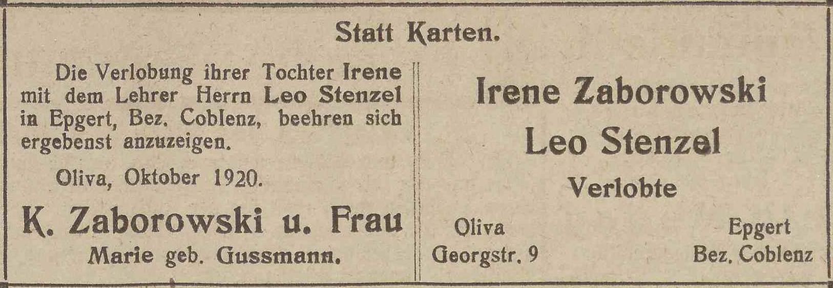 Irene Zaborowski. Leo Stenzel. Kasimir Zaborowski. Marie Zaborowski z domu Gussmann. Olivaer Zeintung nr 232 z 04. 10. 1920 r.