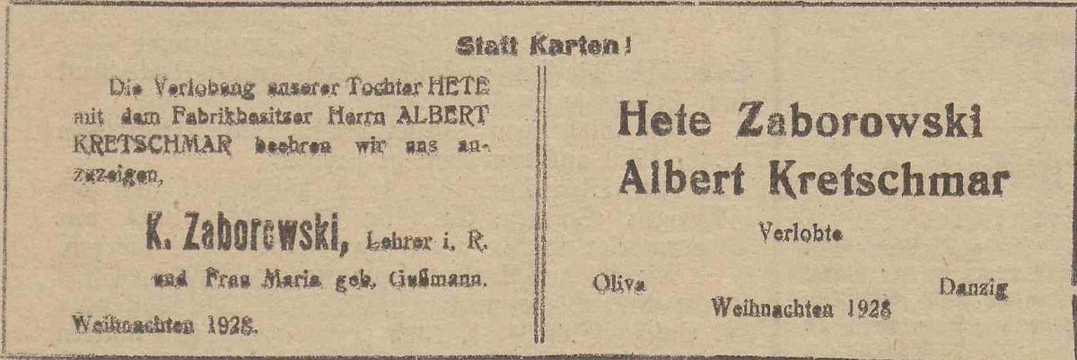 Hete Kretschamer zd. Zaborowski. Albert Kretschamer. Maria Zaborowski zd. Gußmann. Kasmir Zaborowski. Olivaer Zeintung nr 302 z 24. 12. 1928 r.