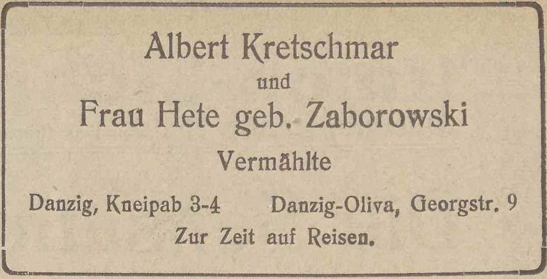 Hete Kretschamer zd. Zaborowski. Albert Kretschamer. Olivaer Zeintung nr 198 z 24. 08. 1929 r.