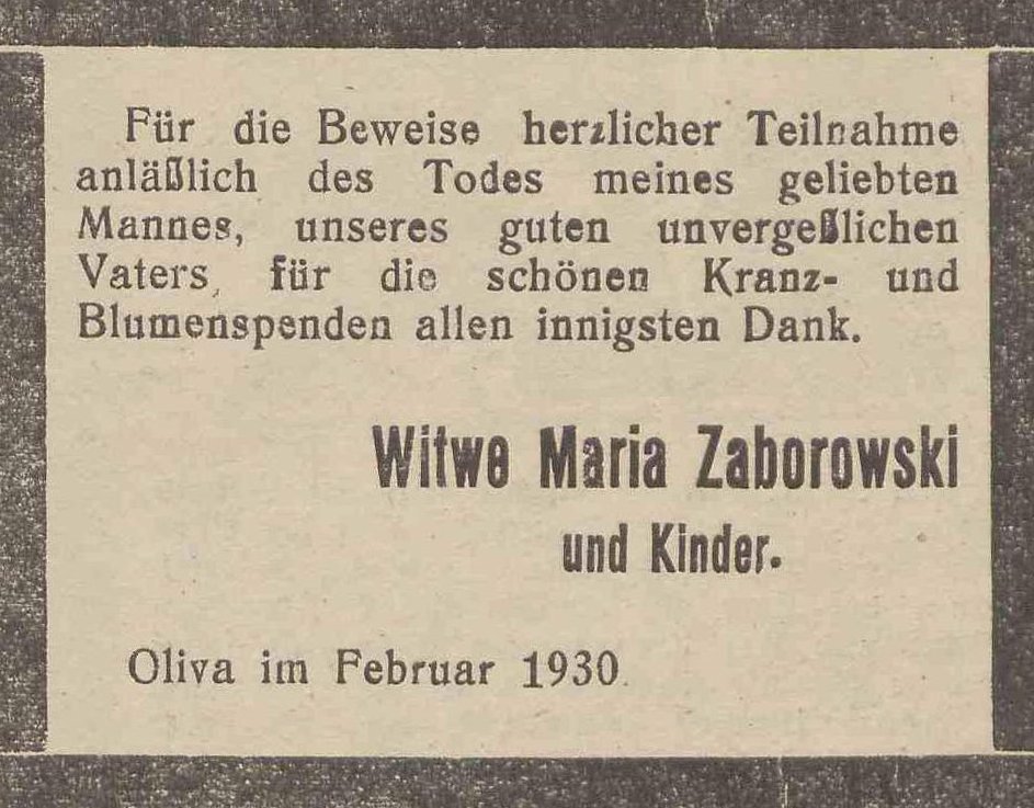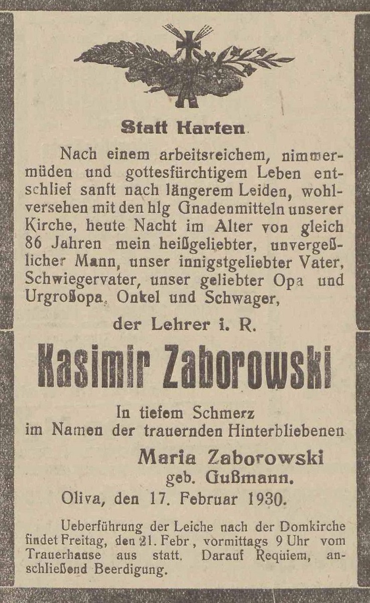 Kasmir Zaborowski. Maria Zaborowski zd. Gußmann. Olivaer Zeintung nr 42 z 19. 02. 1930 r.