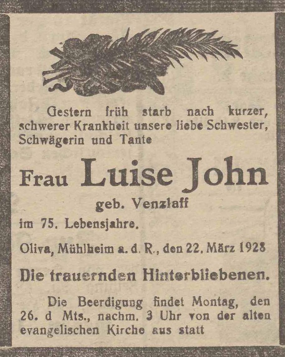 Luise John zd. Venzlaff. Olivaer Zeintung nr 70 z 22. 03. 1928 r.