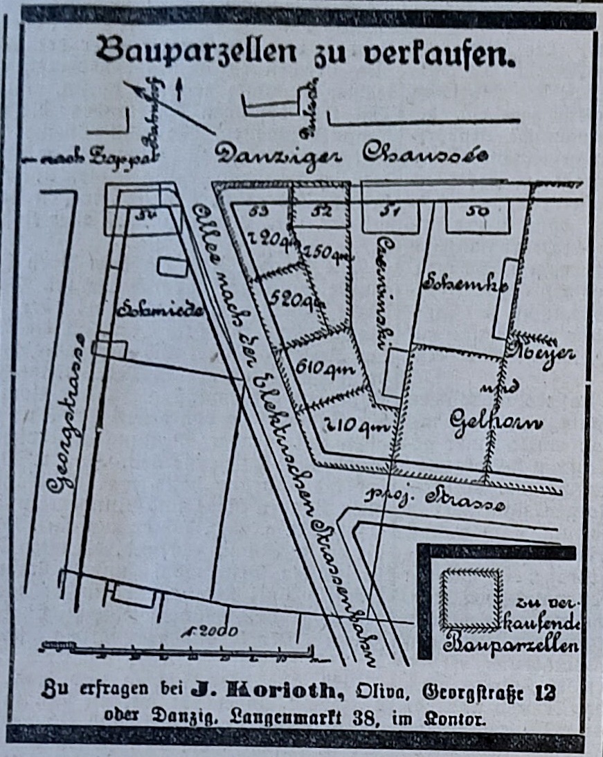 J. Korioth. Meyer & Gelhorn. Reklama. Sprzedaż działek. Olivaer Nachrichten nr 51 z 07. 1906 roku. Przekazała Grażyna Niemyjska.