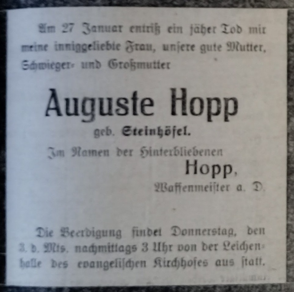 Auguste Hopp zd. Steinhöfel. Rudolf Hopp. Danziger Kreis-Zeitung 1921. Przekazała Grażyna Niemyjska.