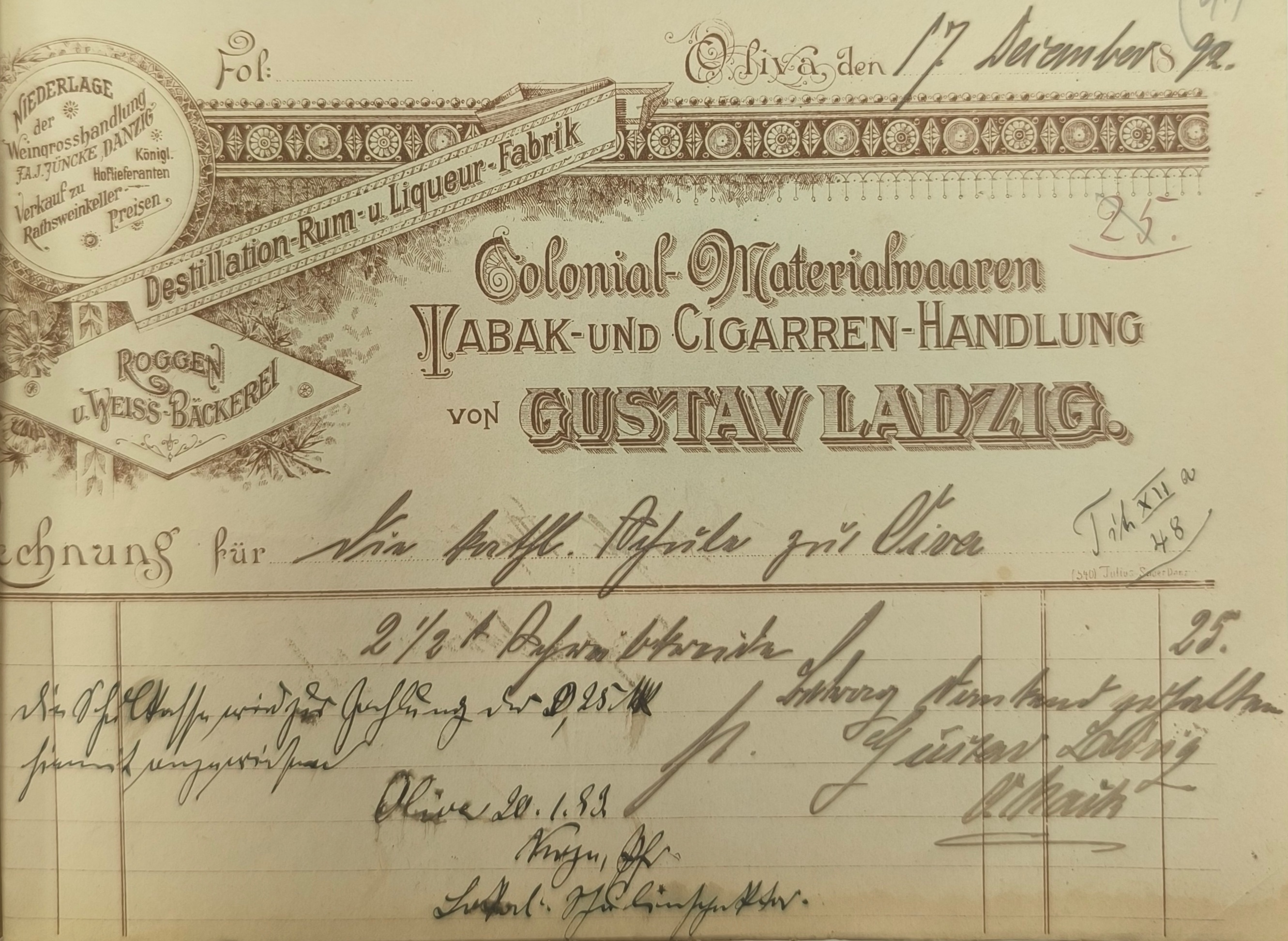 Gustav Ladzig. Rachunek z 17. 12. 1892. Przekazała Grażyna Niemyjska.