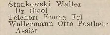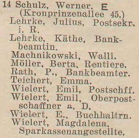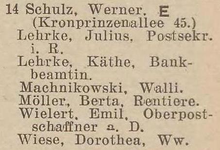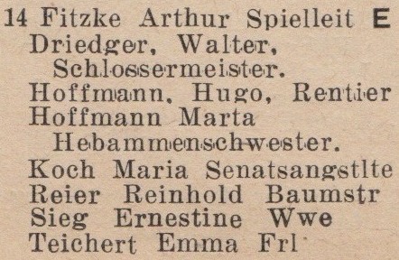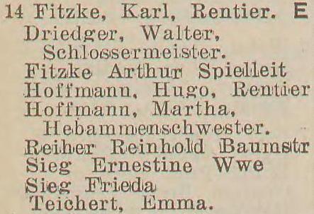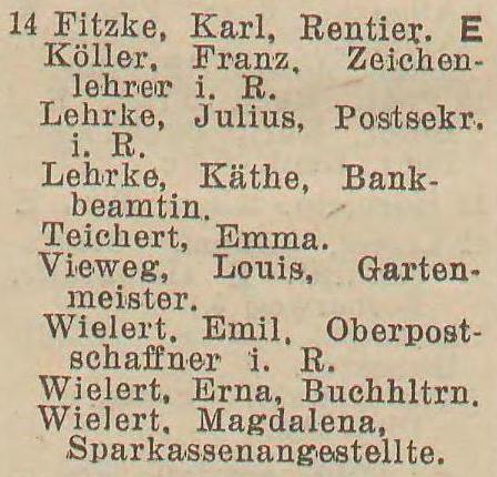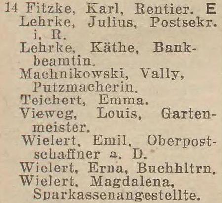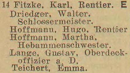 Boehnert, Julie, geb. Cavalier, Ww. Gosie, Johanna, geb. Krause, Ww. Gosie, Johanna, geb. Krause, Ww. Krüger, Emilie, Johanna, Josephine und Malwine, Rentieren. Maul, Eugen, Werft-Sekretair. Wiehr, Wanda, Frl., Gesellschafterin. Zacharias, Franz, Rentier.