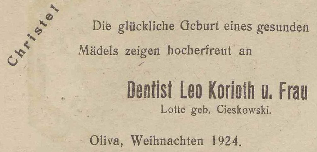Dentysta Leo Korioth. Lotte Korioth zd. Cieskowski. Olivaer Zeintung nr 302 z 27. 12. 1924 r.