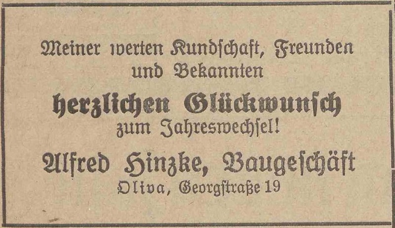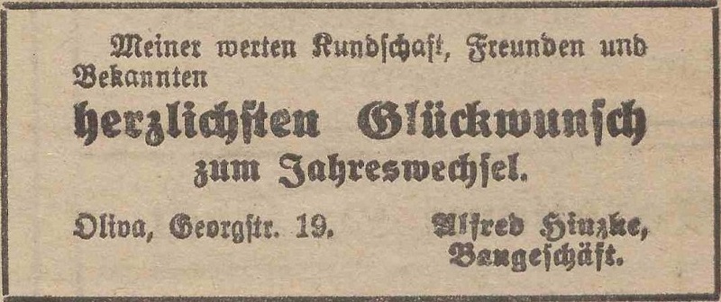 Alfred Hinzke, Bangeschäft. Podziękowania noworoczne, Olivaer Zeitung nr 305 z 31. 12. 1929.