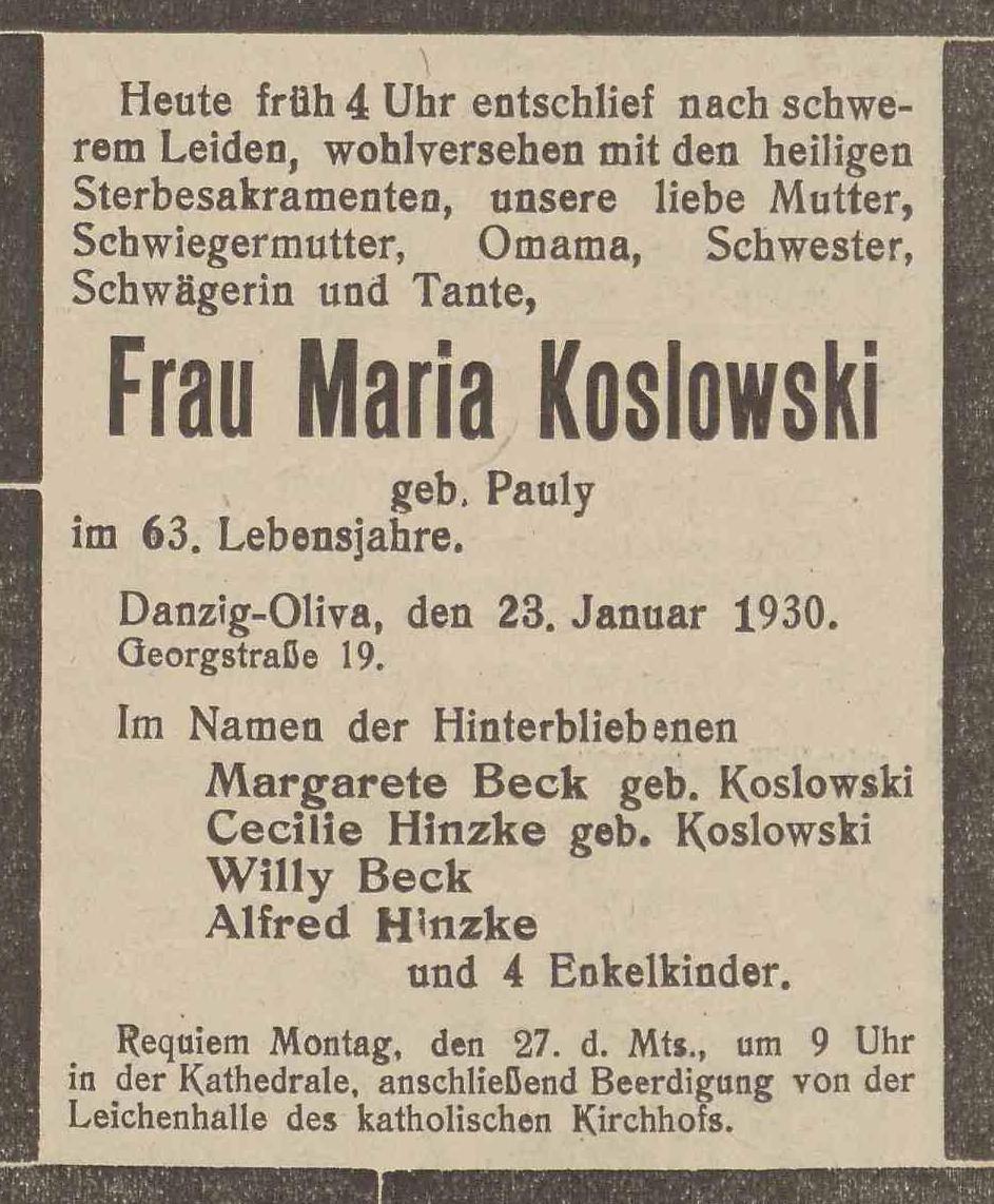 Maria Koslowski zd. Pauly. Willy, Margarete Beck zd. Koslowski. Alfred Cecilie Hinzke zd. Koslowski. Olivaer Zeintung nr 20 z 24. 01. 1930 r.