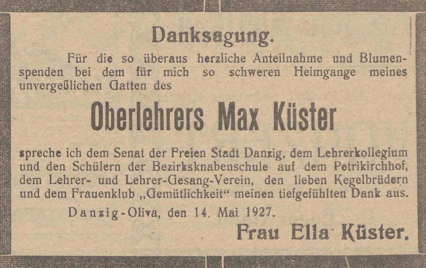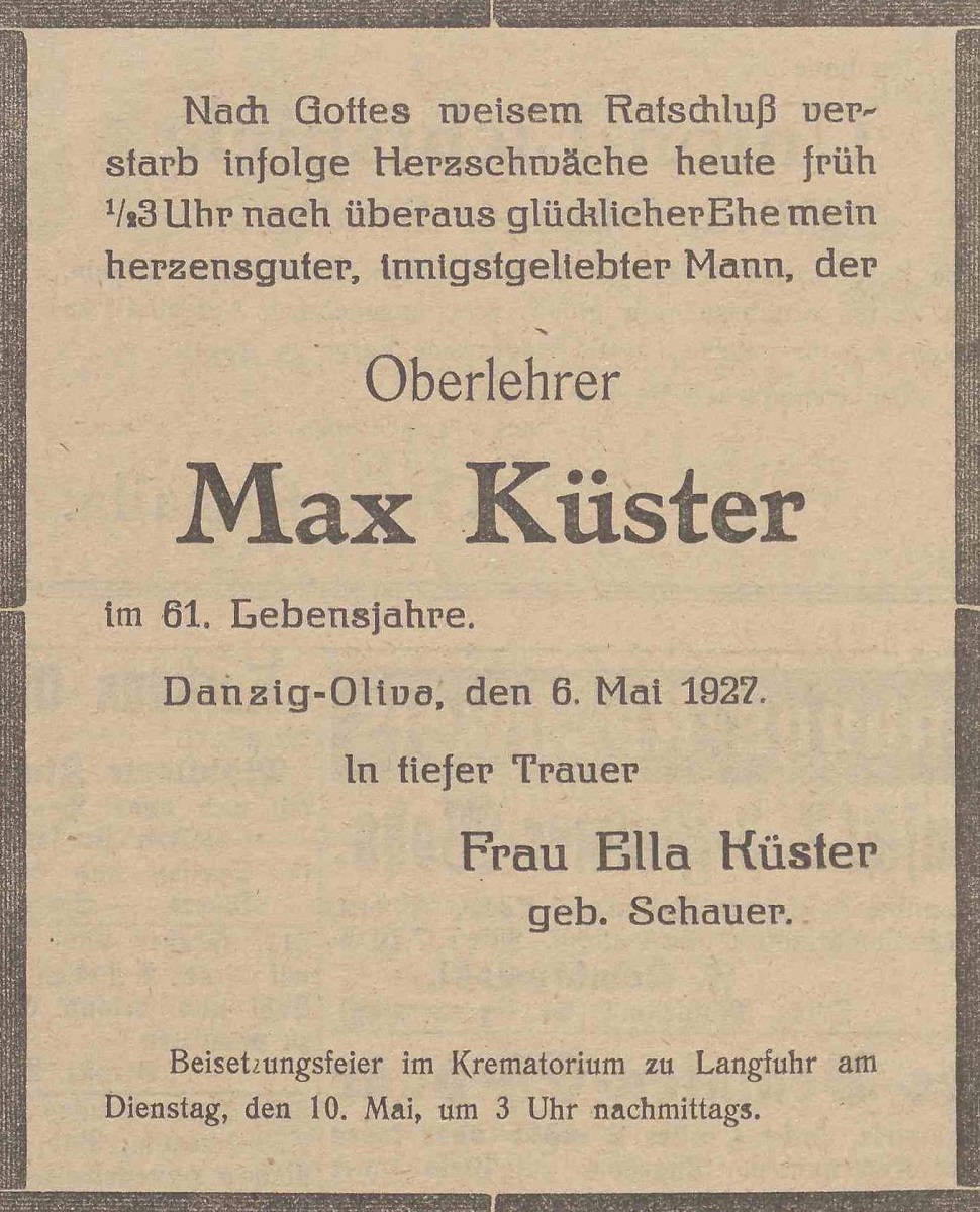 Max Küster (Oberlehler). Ella Küster zd. Schauer. Olivaer Zeintung nr 106 z 07. 05. 1927 r.
