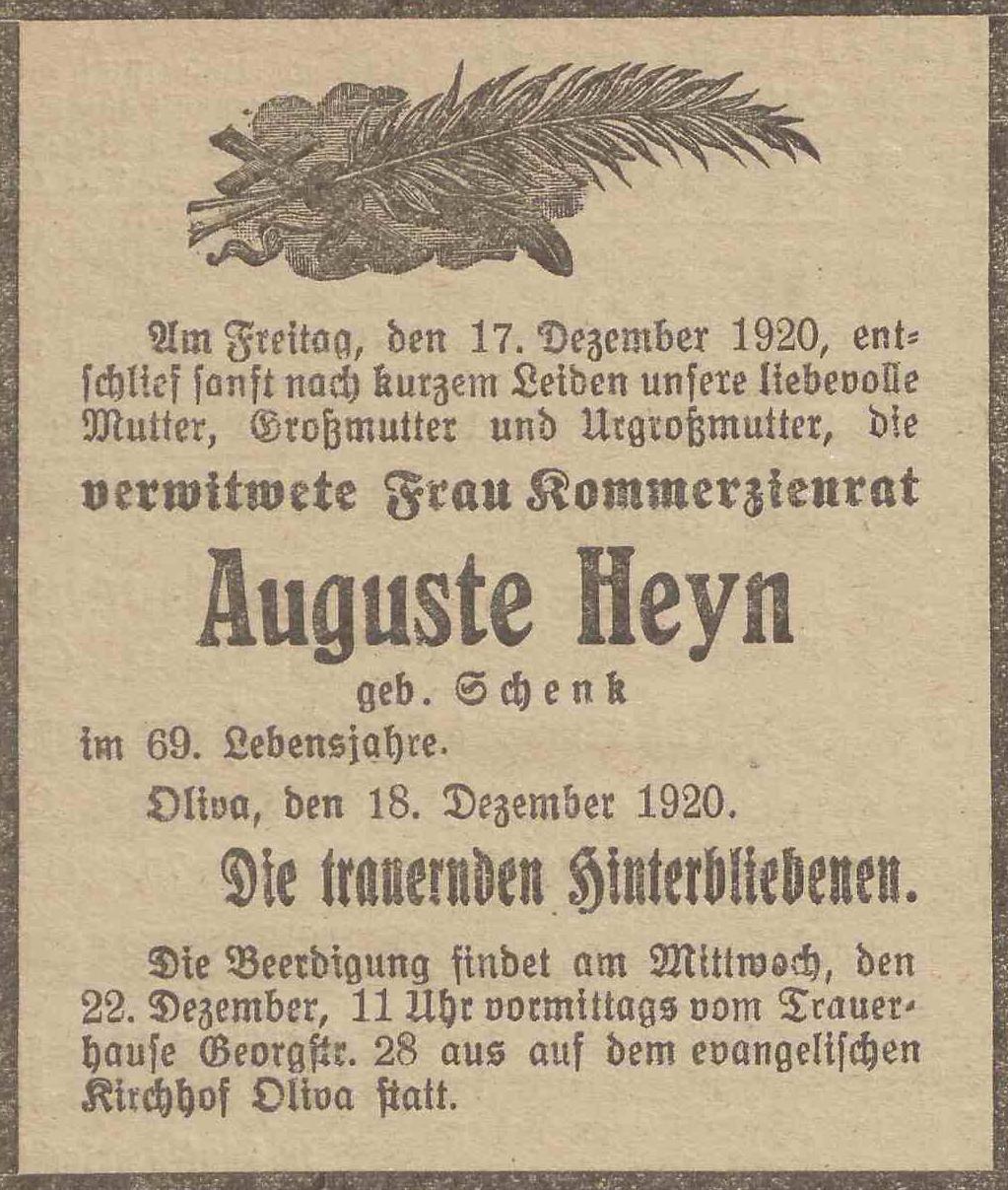 Auguste Heyn. Olivaer Zeintung nr 297 z 20. 12. 1920 r.