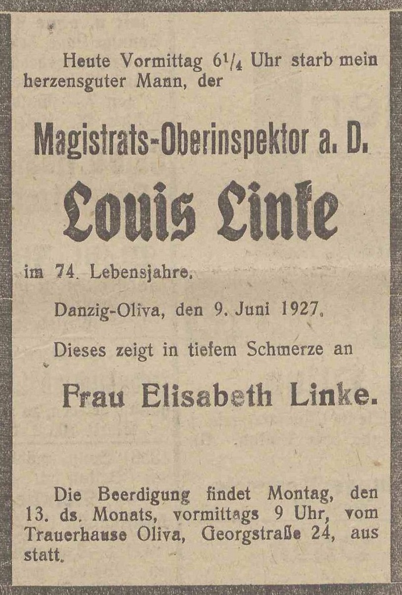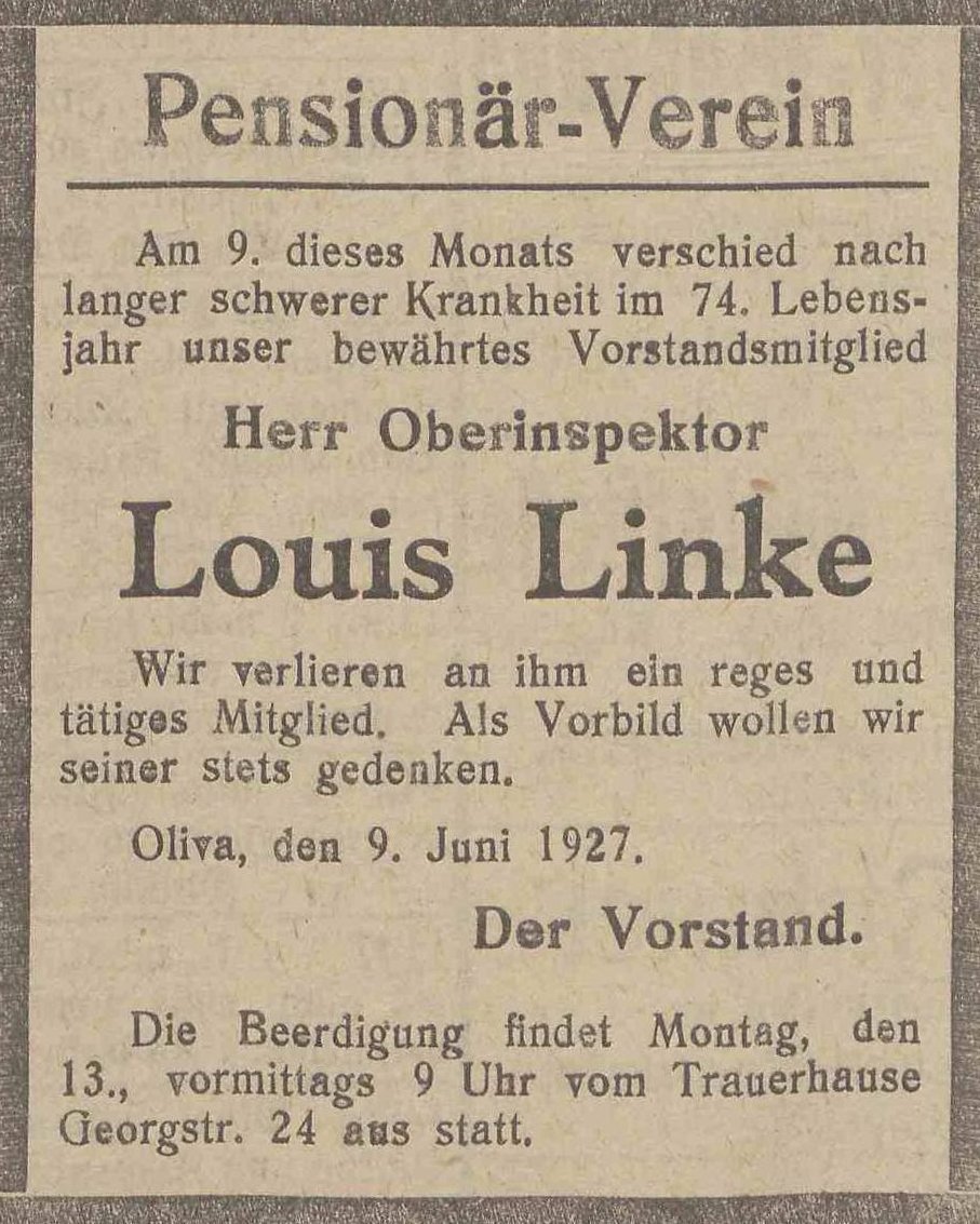 Louis Linke. Olivaer Zeintung nr 133 z 10. 06. 1927 r.