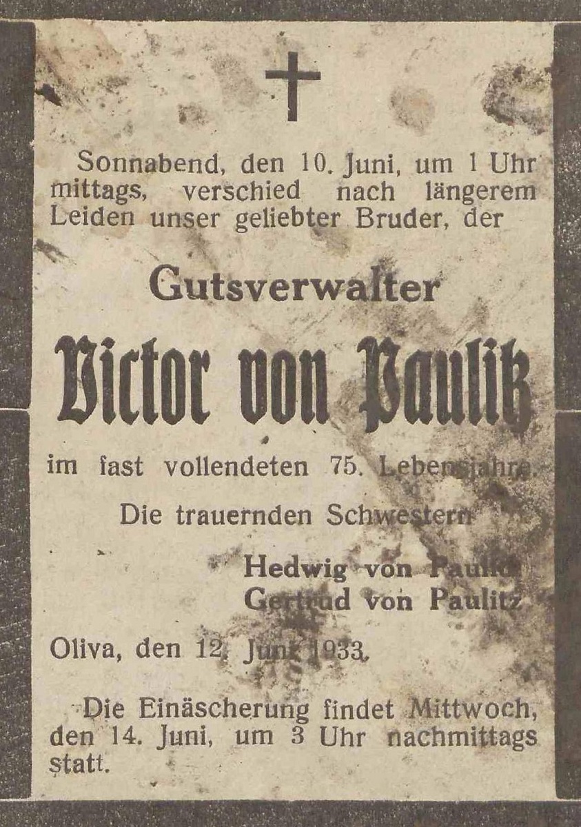 Victor Paulitz. Hedwig Paulitz. Gertrud Paulitz. Danzig-Olivaer Zeintung nr 136 z 13. 06. 1933 r.