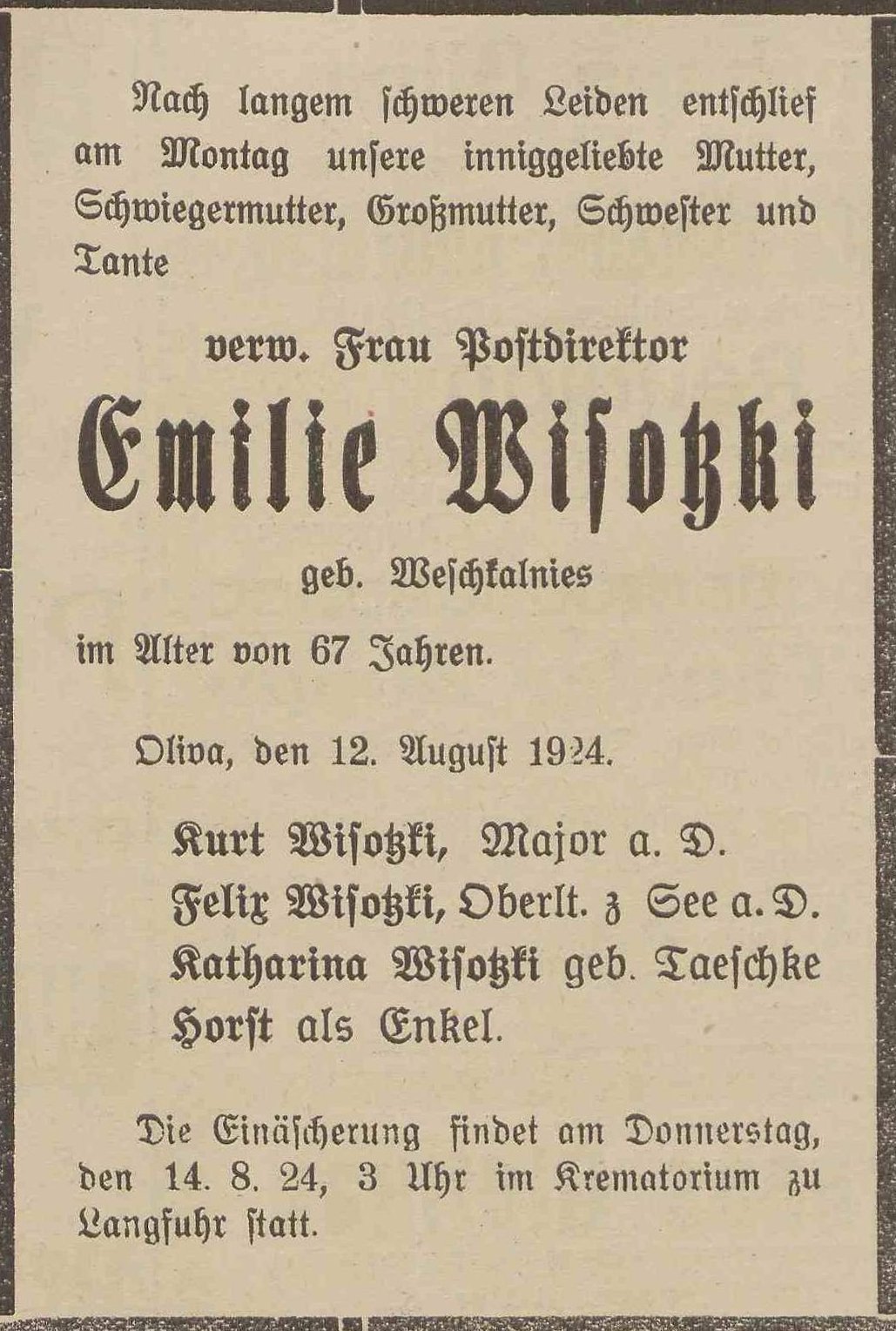 Emilie Wisotzki zd. Weischkalnies. Kurt Wisotzki. Felix Wisotzki. Katharina Wisotzki zd. Taeschke. Olivaer Zeintung nr 187 z 12. 08. 1924 r.
