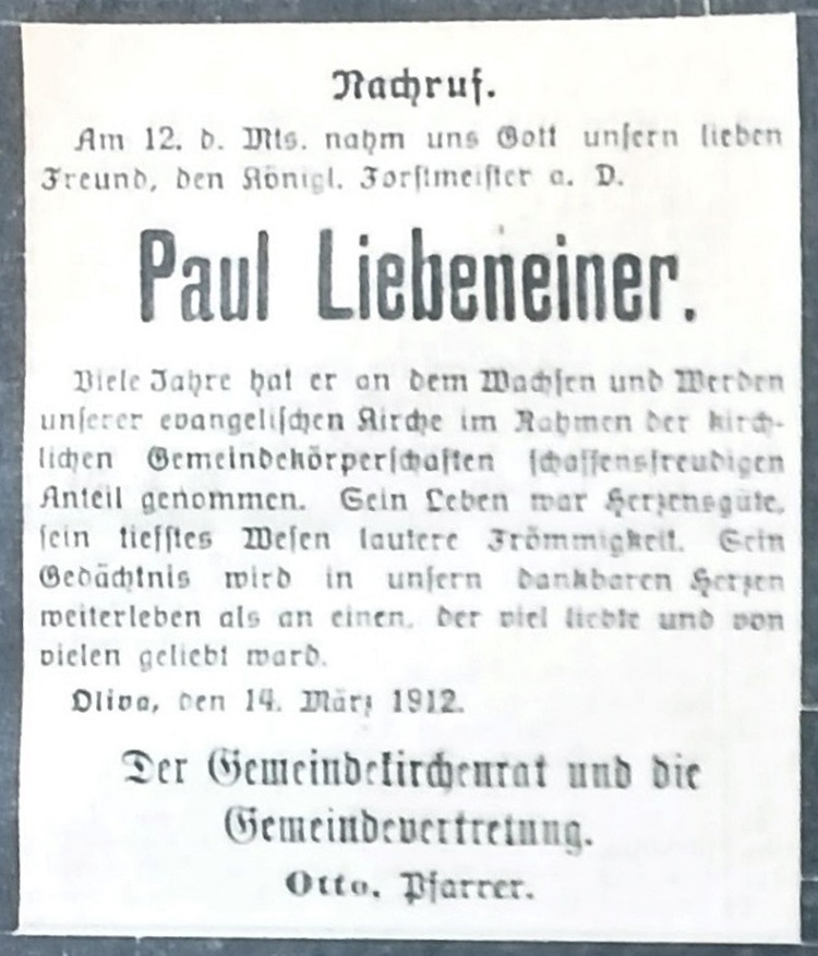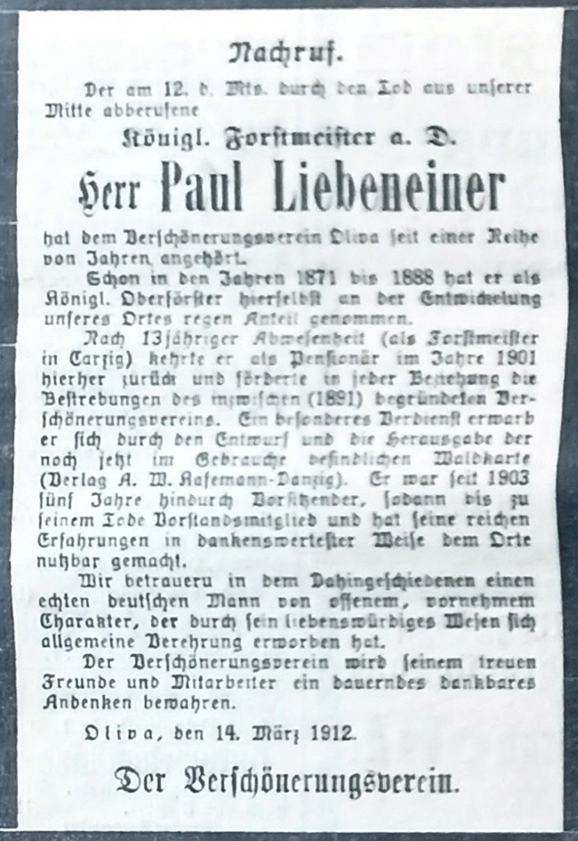 Paul Liebeneiner. Nekrolig. Olivaer Nachrichten nr 22 z 1912 roku. Przekazała Grażyna Niemyjska.