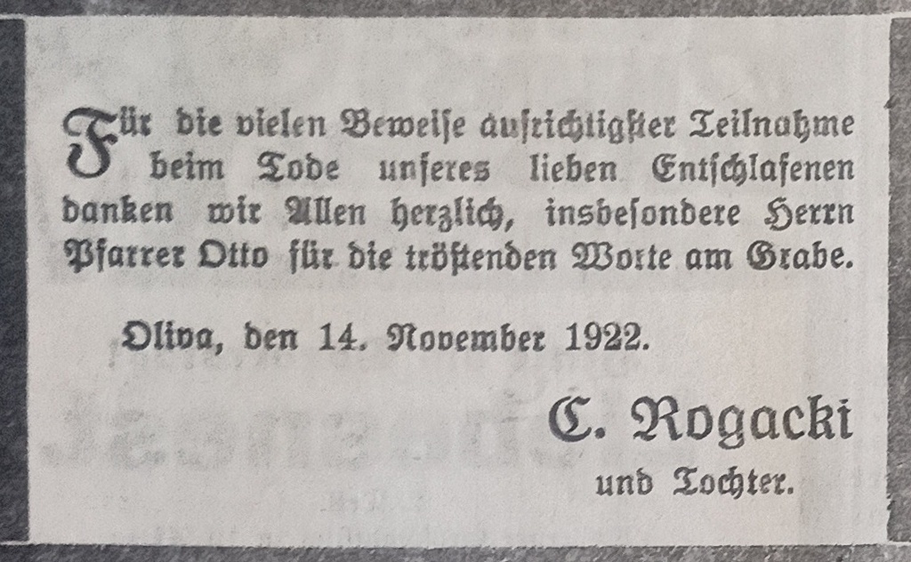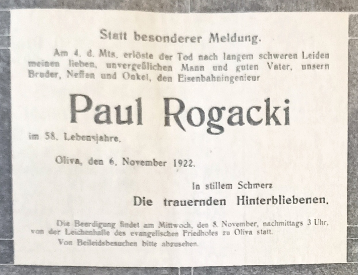 Paul Rogacki. Danziger Kreis-Zeitung 1922. Przekazała Grażyna Niemyjska.