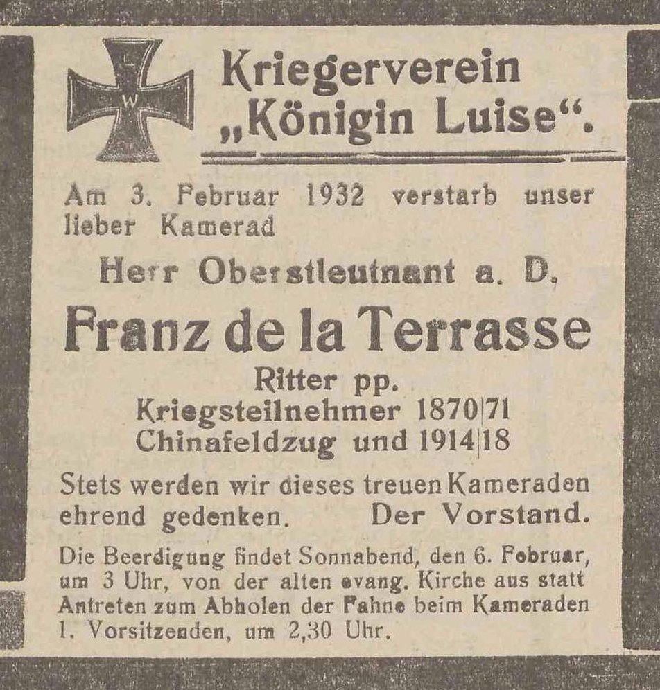 de la Terrasse, Franz, podpółkownik w stanie spoczynku (Oberstleutnant a. D.).