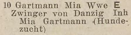 Pojawił się ponownie około 1936 roku już pod nowym właścicielem, którym była wdowa Mia Gartmann do najmniej 1942 roku - Zwinger von Danzig (Hundezucht) - hodowla psów.