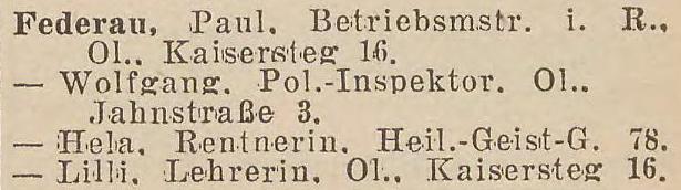 Paul Federau, Betriebsmeisterdiätar, E (w³aœciciel), Kaisersteg 20.