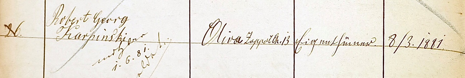 Robert Georg Karpinski. Baukonholle Oliva IXX. Wpis z 08. 03. 1881. Przekazała Grażyna Niemyjska.