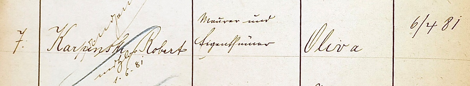 Robert Karpinski. Baukonholle Oliva IXX. Wpis z 06. 04. 1881. Przekazała Grażyna Niemyjska.