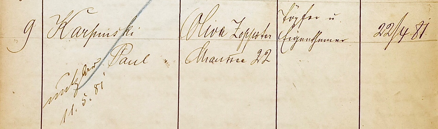 Paul Karpinski. Baukonholle Oliva IXX. Wpis z 22. 04. 1881. Przekazała Grażyna Niemyjska.