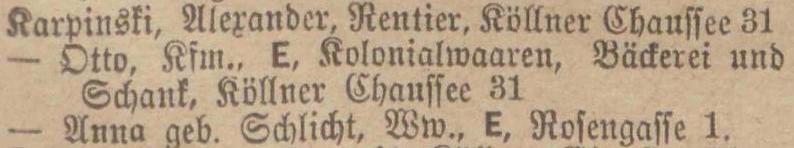 Karpinski, Alexander, Rentier, Köllner Chaussee 31 (Stary Rynek Oliwwski 7).