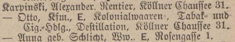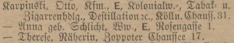 Karpinski, Otto, Kfm., E, Kolonialw.-, Tabak- u. Zigarrenhdlg., Destillation, Köllner Chaussee 31 (Stary Rynek Oliwwski 7). Hausbesitzer: Köllner Chaussee 31 (Stary Rynek Oliwwski 7).